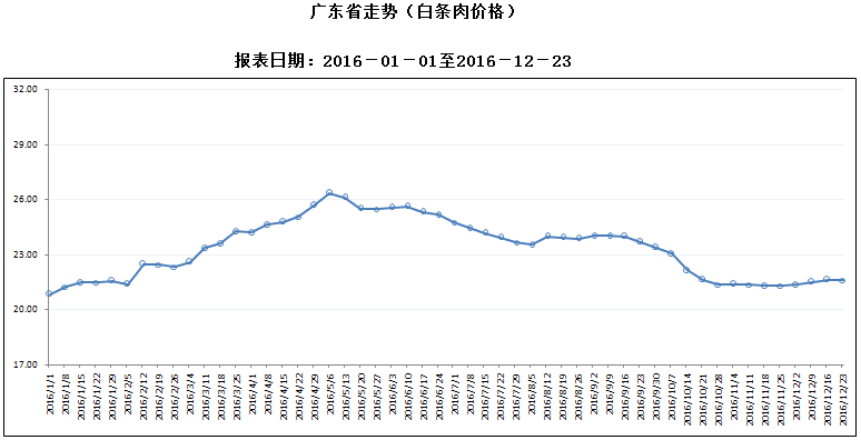 据对全省53家规模以上生猪定点屠宰样本企业监测统计,2016年12月19-25日,生猪平均收购价格为17.60元/公斤,较前一周下降0.11%,较去年同期上涨0.57%。本周较上周环比降幅较大的地区有江门市3.35%,东莞市3.33%,梅州市2.17%。