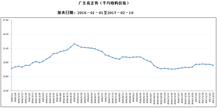 据对全省53家规模以上生猪定点屠宰样本企业监测统计,2017年2月6-12日,生猪平均收购价格为18.04元/公斤,较前一周下降1.20%,较去年同期下降2.64%。本周较上周环比降幅较大的地区有韶关市3.72%,潮州市3.08%,清远市2.77%。