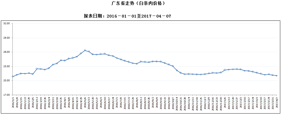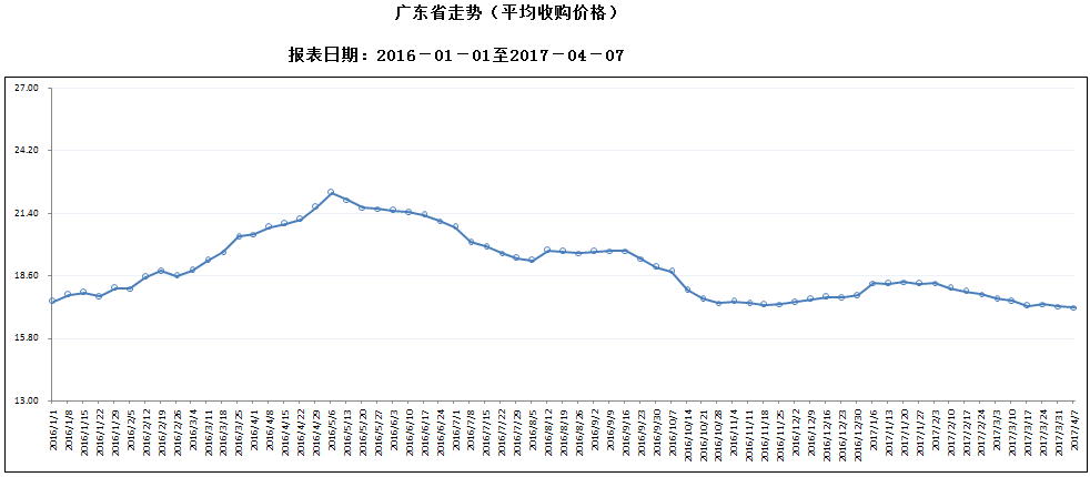 据对全省53家规模以上生猪定点屠宰样本企业监测统计,2017年4月1-7日,生猪平均收购价格为17.16元/公斤,较前一周下降0.35%,较去年同期下降17.30%。本周较上周环比降幅较大的地区有东莞市2.87%,惠州市1.83%,梅州市1.69%,但仍有9个市呈上涨态势,其中佛山、广州和韶关涨幅均超过1%。