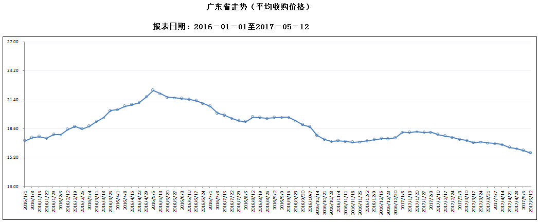 据对全省52家规模以上生猪定点屠宰样本企业监测统计,2017年5月6-12日,生猪平均收购价格为16.24元/公斤,较前一周下降1.58%,较去年同期下降26.15%。本周较上周环比降幅较大的地区有佛山市4.09%,湛江市3.88%,茂名市3.73%,但仍有2个市呈上涨态势。