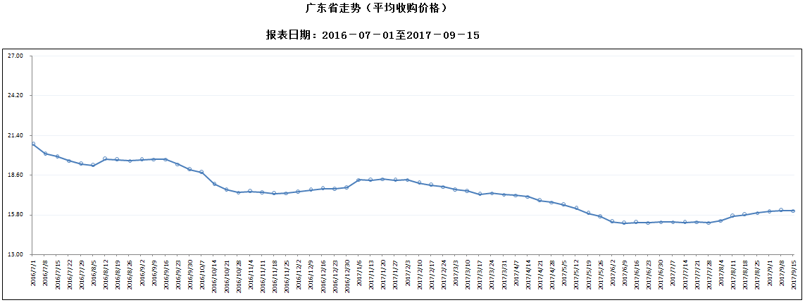 据对全省53家规模以上生猪定点屠宰样本企业监测统计,2017年9月9-15日,生猪平均收购价格为16.07元/公斤,较前一周下降0.12%,较去年同期下降18.38%。本周较上周环比降幅较大的地区有深圳市6.27%,湛江市1.91%,广州市1.23%,但仍有6个市呈上涨态势,其中茂名涨幅超过2%。