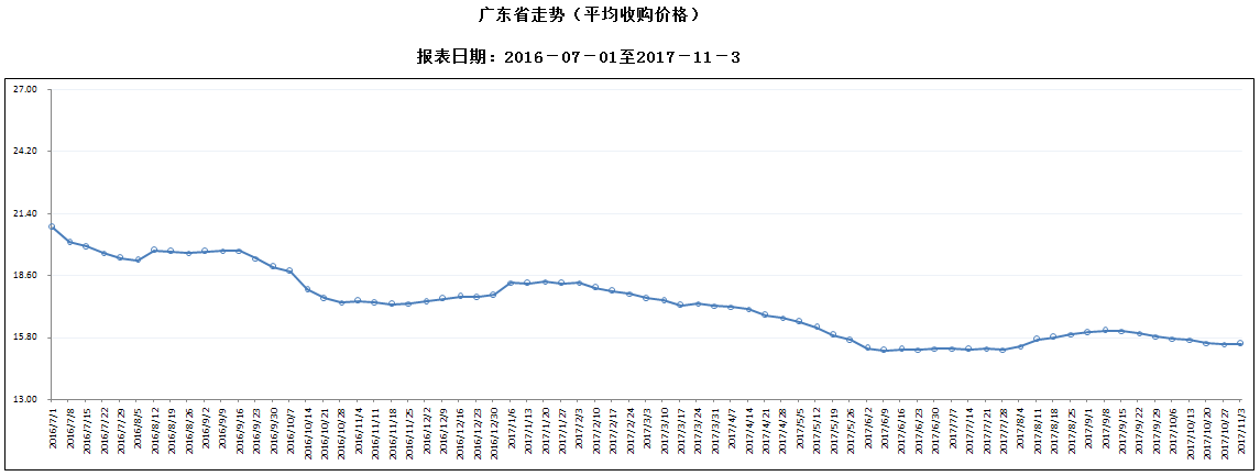 据对全省53家规模以上生猪定点屠宰样本企业监测统计,2017年10月28-11月3日,生猪平均收购价格为15.49元/公斤,较前一周上涨0.06%,较去年同期下降11.23%。本周较上周环比涨幅较大的地区有珠海市4.11%,江门市3.11%,惠州市1.50%,但仍有8个市呈下降态势,其中中山和梅州降幅分别超过2%和3%。