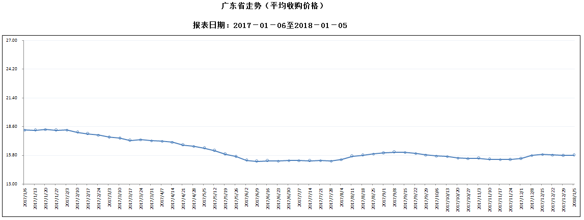 据对全省53家规模以上生猪定点屠宰样本企业监测统计,2017年12月30-2018年1月5日,生猪平均收购价格为15.80元/公斤,较前一周上涨0.25%,较去年同期下降13.42%。本周较上周环比涨幅较大的地区有茂名市3.92%,珠海市1.95%,湛江市1.27%,但仍有9个市呈下降态势,其中深圳降幅超过2%。