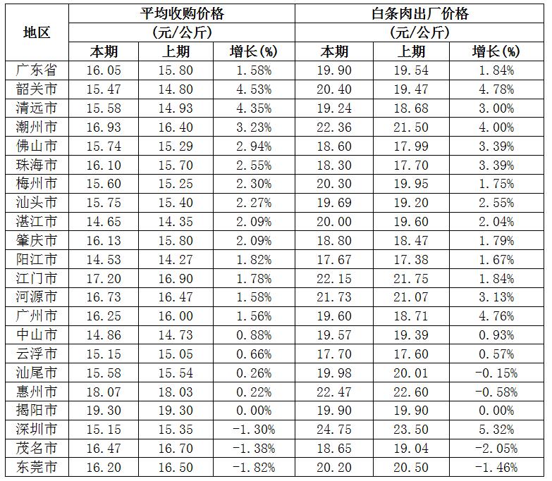 白条肉平均出厂价格为19.90元/公斤,较前一周上涨1.84%,较去年同期下降11.12%。本周较上周环比涨幅较大的地区有深圳市5.32%,韶关市4.78%,广州市4.76%,但仍有4个市呈下降态势,其中茂名降幅超过2%。