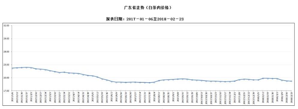 据对全省53家规模以上生猪定点屠宰样本企业监测统计,2018年2月17-23日,生猪平均收购价格为15.30元/公斤,较前一周下降0.13%,较去年同期下降13.85%。本周较上周环比降幅较大的地区有阳江市1.93%,东莞市1.23%,汕头市1.19%,但仍有5个市呈上涨态势,其中深圳涨幅超过7%。