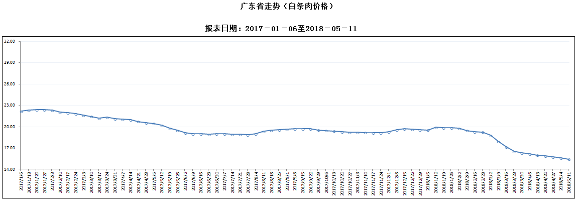 据对全省53家规模以上生猪定点屠宰样本企业监测统计,2018年5月5-11日,生猪平均收购价格为11.80元/公斤,较前一周下降1.26%,较去年同期下降27.34%。本周较上周环比降幅较大的地区有广州市4.26%,汕头市4.22%,清远市3.76%,但仍有4个市呈上涨态势。