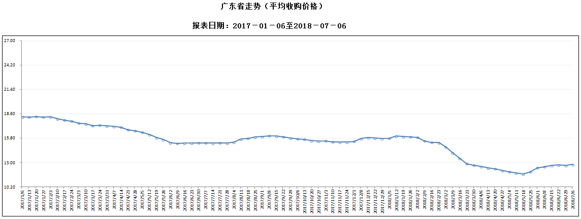 据对全省53家规模以上生猪定点屠宰样本企业监测统计,2018年6月30-7月6日,生猪平均收购价格为12.80元/公斤,较前一周上涨0.95%,较去年同期下降16.18%。本周较上周环比涨幅较大的地区有珠海市3.97%,韶关市3.94%,湛江市3.85%,但仍有3个市呈下降态势,其中惠州降幅超过1%。