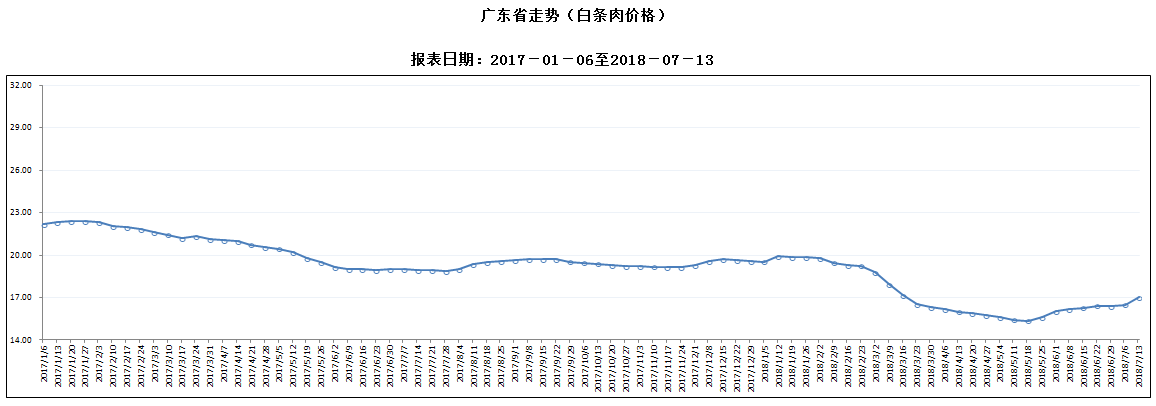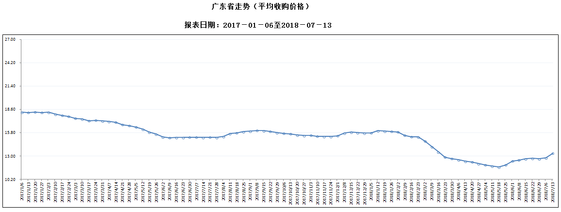 据对全省53家规模以上生猪定点屠宰样本企业监测统计,2018年7月7-13日,生猪平均收购价格为13.36元/公斤,较前一周上涨4.38%,较去年同期下降12.39%。本周较上周环比涨幅较大的地区有韶关市7.75%,江门市6.92%,湛江市6.85%,但东莞仍呈下降态势,且降幅超过1%。