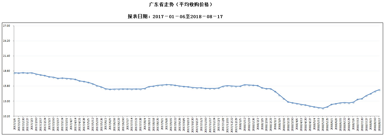 据对全省53家规模以上生猪定点屠宰样本企业监测统计,2018年8月11-17日,生猪平均收购价格为15.13元/公斤,较前一周上涨2.02%,较去年同期下降4.24%。本周较上周环比涨幅较大的地区有汕头市6.14%,珠海市4.58%,清远市4.55%,但汕尾市呈下降态势。