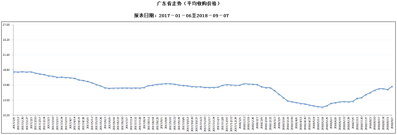 据对全省53家规模以上生猪定点屠宰样本企业监测统计,2018年9月1-7日,生猪平均收购价格为15.57元/公斤,较前一周上涨4.01%,较去年同期下降3.23%。本周较上周环比涨幅较大的地区有东莞市14.93%,梅州市6.34%,清远市5.99%,但茂名呈下降态势,且降幅超过1%。
