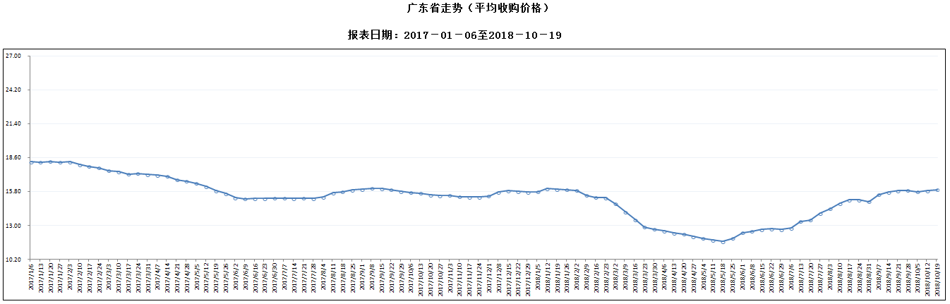 据对全省53家规模以上生猪定点屠宰样本企业监测统计,2018年10月13-19日,生猪平均收购价格为15.96元/公斤,较前一周上涨0.57%,较去年同期上涨2.84%。本周较上周环比涨幅较大的地区有深圳市5.14%,广州市2.22%,肇庆市1.44%,但有4个市呈下降态势,其中江门降幅超过1%。