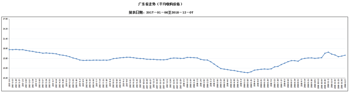 据对全省53家规模以上生猪定点屠宰样本企业监测统计,2018年12月1-7日,生猪平均收购价格为16.66元/公斤,较前一周上涨1.40%,较去年同期上涨5.64%。本周较上周环比涨幅较大的地区有江门市3.37%,深圳市3.33%,东莞市2.90%,但揭阳和湛江呈下降态势,降幅均超过1%。