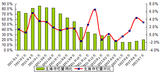 据农业农村部养殖场直联直报信息平台监测数据,2022年7月,我省生猪存栏环比上升3.20%,同比上升20.17%。