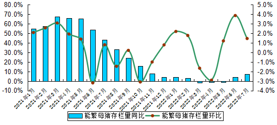 据农业农村部养殖场直联直报信息平台监测数据,2022年7月,我省能繁母猪存栏量环比上升1.46%,同比上升7.22%。