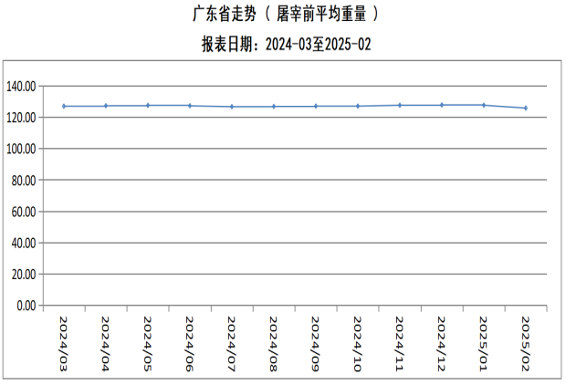 2月份,跟踪监测的304家生猪定点屠宰企业生猪屠宰前平均重量125.69公斤,环比下降1.42%。