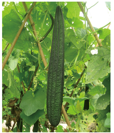 特征特性 : 杂交一代组合。 植株生长势和分枝性强。 从播种至始收春植 71 天、秋植 40 天,延续采收期春植 42 天、秋植36 天,全生育期春植 113 天、秋植 76 天。第一朵雌花着生节 位 6.3 ~ 13.8 节, 第 一 个 瓜 座 瓜 节 位 11.9 ~ 16.0 节。瓜呈长棍棒形,瓜色深绿,瓜外皮无花斑,棱沟浅,棱色墨绿。瓜长 48.1 ~ 56.6 厘米,横径 4.69 ~ 4.91 厘米。单瓜重410.2 ~ 504.1 克。商品瓜率 88.48% ~ 89.11%。肉质脆,感观品质鉴定为优,品质分 88.7 分;理化品质检测结果:粗蛋白含量 0.77 克 /100 克,维生素 C 含量 96 毫克 / 千克,可溶性固形物含量 3.4 克 /100 克,粗纤维含量 0.63 克 /100 克。抗病性接种鉴定为感枯萎病。田间表现耐热性、耐寒性、耐涝性和耐旱性强。