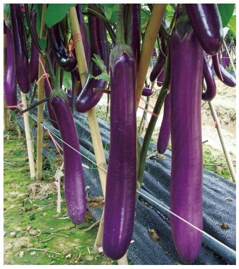特征特性 : 杂交一代品种。 从播种至始收春季 107天、 秋季87天, 延续采收期春季43天、 秋季59天, 全生育期春季150天、秋季146天。 门茄座果率77.05%~90.05%。 果长棒形, 头尾匀称,尾部圆,果身微弯;果皮紫红色,果面平滑、着色均匀、有光泽,果上萼片呈紫绿色;果肉白色、紧密。果长 29.1 ~ 30.4厘米,果粗 5.01 ~ 5.18 厘米,单果重 244.9 ~ 288.5 克,商品率 92.68% ~ 96.32%。感观品质鉴定为优,品质分 89.3 分。还原糖含量 2.66 克 /100 克,维生素 C 含量 90 毫克 / 公斤,蛋白质含量 0.75 克 /100 克,可溶性固形物含量 4.2 克 /100 克。青枯病人工接种鉴定表现耐病;耐热性、耐寒性、耐涝性和耐旱性均表现强。