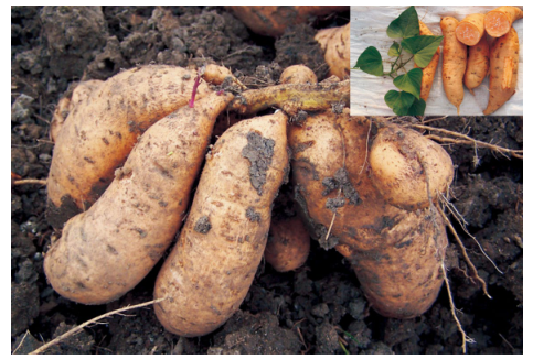 特征特性 : 萌芽性中等,株型半直立,中长蔓,中等分枝,顶叶绿带紫边,叶形心齿形,叶脉、茎绿色,结薯集中,单株结薯数中等,薯形下膨,薯皮黄色,薯肉桔红色,薯身光滑、美观,薯块大小均匀,耐贮性较好。平均干物率 28.11%,食味76.8分, 淀粉率17.29%, 胡萝卜素含量12.82毫克/100克鲜薯。中抗薯瘟病。