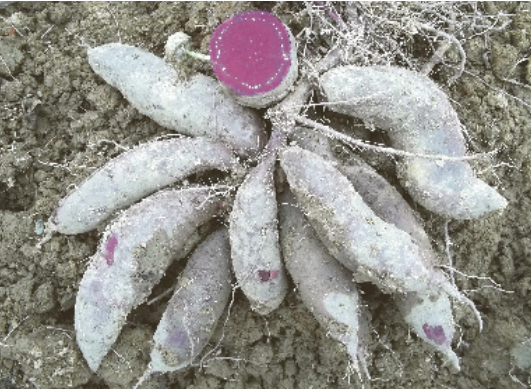 特征特性:短蔓半直立型,单株分枝数9-15条,蔓粗中等。叶形尖心带齿,叶脉紫色,茎绿带浅紫色。薯块长纺缍形,薯皮紫色,薯肉紫色,单株结薯6.8个,大中薯率71.9%,结薯集中,整齐。花青素含量高,薯身光滑、薯块较均匀,耐贮性好。薯块干物率29.92%,淀粉率19.68%;花青素含量38.6mg/100g鲜薯。抗蔓割病,中抗薯瘟病。食用品质优。区试鲜薯、干薯平均亩产分别为2000公斤左右、570公斤左右。