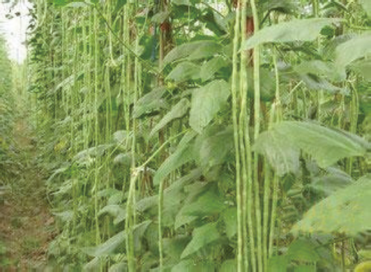特征特性:从播种至始收春季64 d、秋季43 d;延续采收期春季40 d、秋季36 d;全生育期春季104d、秋季79d。第一穗花序着生节位4.5~5.3节。该品种优质,早中熟。蔓生型,主茎绿色,生长势强,分枝少。叶片较小,叶色绿。始花节位5节。花白色,双荚率高,持续结荚能力强。荚条直,肉厚,营养丰富。种子肾形,红褐麻点间白色。荚果呈长圆条形,绿白色,荚面微凸,纤维少。单荚重28.5~28.7 g,单株产量0.29~0.48 kg,商品率96.46%~97.30%。田间表现耐热性、耐涝性和耐旱性强,耐寒性中等。经农业部蔬菜水果质量监督检验测试中心(广州)测定,鲜荚粗蛋白含量为1.8%,维生素C为390.9 mg.kg-1,还原糖含量为1.42%,粗纤维为1.1%。平均亩产1600公斤左右。