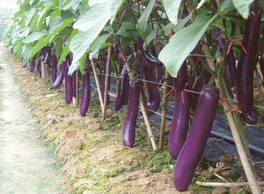 特征特性:该品种植株生长势强,连续座果能力强。播种至初收,春植107天左右,秋植84天左右,延续采收期春季45天、秋季59天,全生育期春季152天、秋季143天。门茄座果率84.79%~88.75%,座果均匀,果实长棒形,头尾匀称。果色深紫红,果面平滑,有光泽。商品果长29.6~30.3 cm,果粗约5.0 cm,单果重284.9~286.1g,商品率高。果肉白色,肉质紧实,口感好。中熟,耐老,耐贮运,中抗青枯病,耐热,耐寒性较好。平均亩产4500公斤左右。