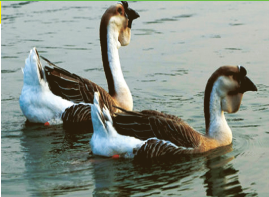 特征特性:狮头鹅体躯硕大,头深广,额和脸侧有较大的肉瘤,从头的正面观之如雄狮状,是我国唯一的大型鹅种,也是世界最大型鹅种之一,具有体型大、生长速度快、耐粗饲、适应性好、抗逆性强及肉质风味佳等优点。羽毛灰褐色,腹羽灰白色。胫蹼桔红色略带黑斑,肉瘤、喙黑色。成年体重公鹅10-12千克,母鹅8 -10千克。母鹅开产日龄在200-240天,种鹅利用年限为4-5年,盛产期为第二至第四年。近三年共向社会推广优质鹅苗20万只,母鹅年产蛋28-32枚;雏鹅饲养70天,公鹅6.4千克,母鹅5.8千克。产肝性能卓越:经强制育肥,平均肥肝重630克。