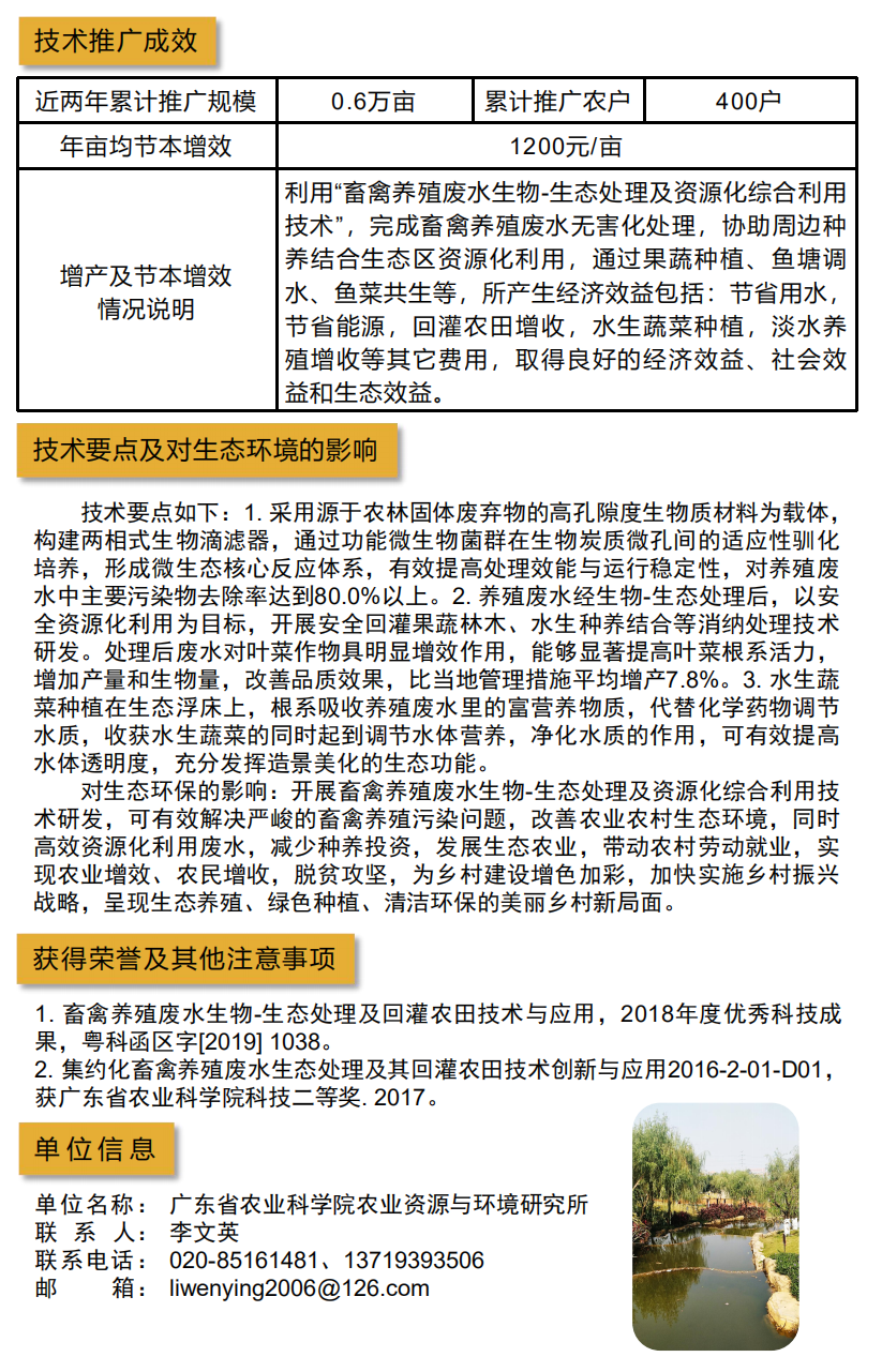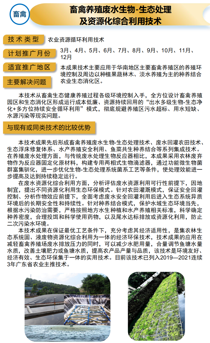 2021年农业主推技术:畜禽养殖废水生物-生态处理 及资源化综合利用技术