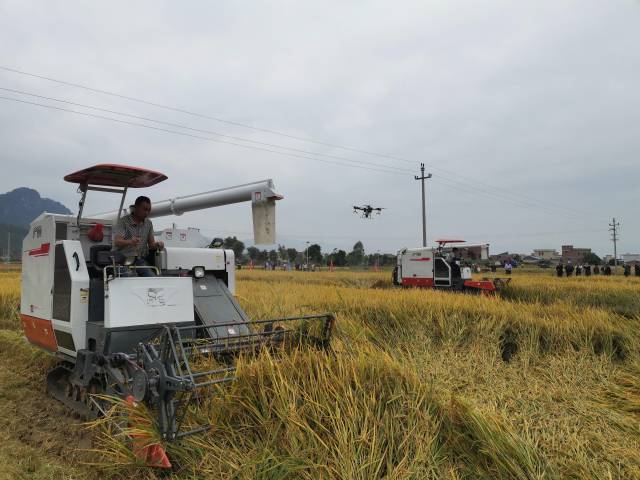 水稻收割,农机是主力。数据显示,去年广东省水稻耕种收综合机械化率75.3%,其中机收率超93%。