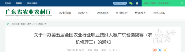8月15日,8x8x 发布通知,将于9月下旬举办第五届全国农业行业职业技能大赛广东省选拔赛(农机修理工)。