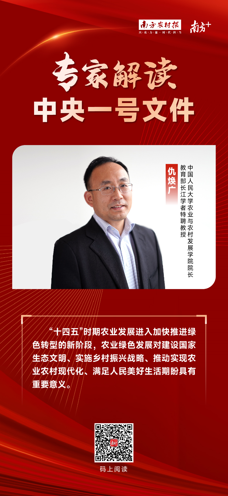 聚焦“农业绿色发展”,南方农村报(下称“南农”)记者特邀中国人民大学农业与农村发展学院院长仇焕广对今年中央一号文件进行解读。仇焕广指出,在“强化农业科技和装备支撑”部分强调“推进农业绿色发展”,意味着在研发新技术、新装备的过程时,不能一味地以经济利润最大化为目标,而要兼顾绿色发展目标。他分析了当前我国重大危害入侵物种防控治理面临的三大挑战;此外,也为绿美广东生态建设指出了三个发力点。