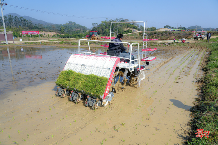 人勤春来早,田间农事忙。在潮州市饶平县樟溪镇四罗村的果蔬生产基地里,高速插秧机在田间穿梭自如,所过之处留下一簇簇青翠的秧苗;远处,载重量达70公斤的植保无人机呼啸升空后,在稻田上方来回盘旋进行撒播作业;另一边,“美香占2号”“南晶香占”“普薯32号”等优良品种集中亮相,种植户正在了解品种引进、种植的细节,咨询农业机械报废更新补贴政策……