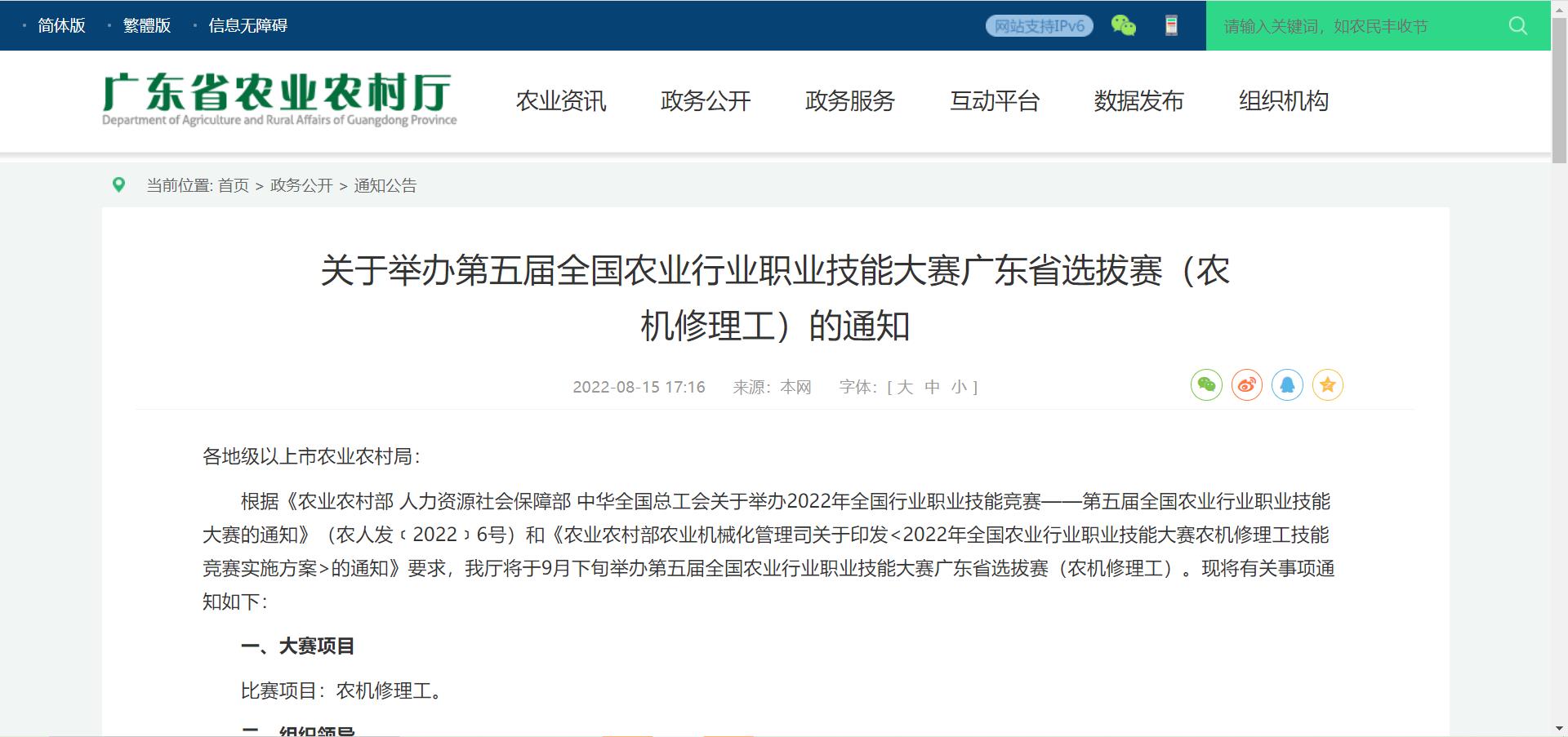8月15日,8x8x 发布通知,将于9月下旬举办第五届全国农业行业职业技能大赛广东省选拔赛(农机修理工)。