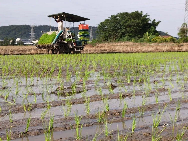 盛夏八月,鹤山骄阳似火,稻田里,插秧机途经之地,一棵棵秧苗被整齐精准地插入田间,不一会儿,农田换上一身“绿装”。今年“双抢”季,天气整体较好,利于早稻收割和晚稻播种。记者从鹤山市农业农村局获悉,目前,全市晚稻播种稳步推进,截至7月底,完成播种面积5160公顷(7.74万亩),目前正在进行晚稻抢插,稻田里一片繁忙的景象。