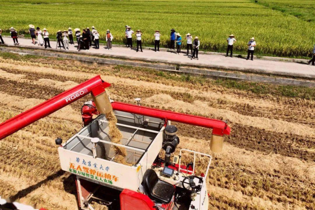 远处山峦连绵起伏,近处稻田金浪翻涌。7月14日,河源市东源县柳城镇的万绿智慧无人农场(以下简称“万绿智慧农场”)迎来首季丰收,无人驾驶收割机和运粮车代替人工在田间“劳作”。