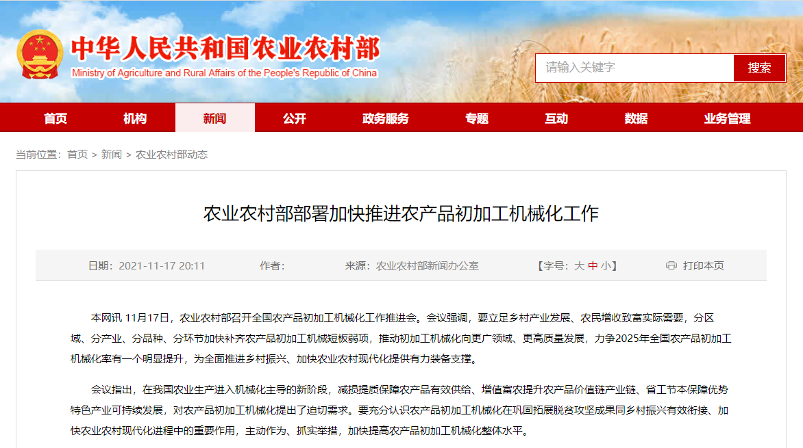 11月17日,农业农村部召开全国农产品初加工机械化工作推进会。会议强调,要立足乡村产业发展、农民增收致富实际需要,分区域、分产业、分品种、分环节加快补齐农产品初加工机械短板弱项,推动初加工机械化向更广领域、更高质量发展,力争2025年全国农产品初加工机械化率有一个明显提升,为全面推进乡村振兴、加快农业农村现代化提供有力装备支撑。