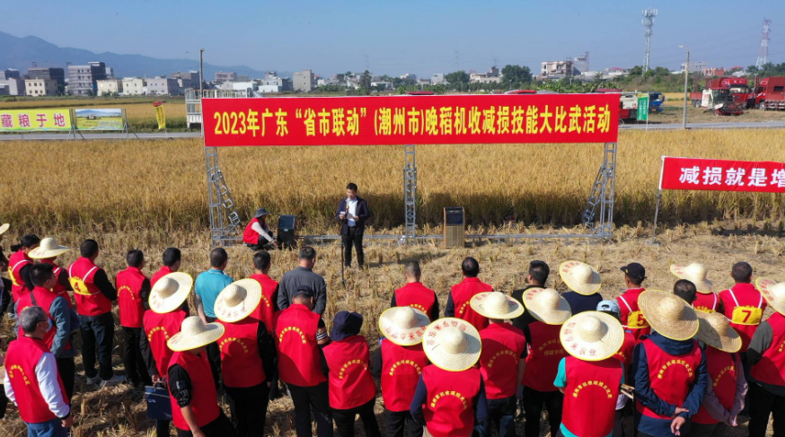 近日,2023年广东“省市联动”(潮州市)晚稻机收减损技能大比武活动在沙溪镇高厦一村举行,来自潮州市各县(区)的8名选手驰骋田间、大秀农技,全面推广机收减损技术,提升粮食收获质量。