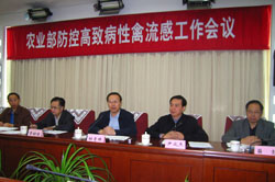 农业部副部长尹成杰在会上就当前防控工作进行了部署。他说,由杜青林部长任指挥长的农业部突发重大动物疫情应急指挥中心已经全面展开各项工作。应急指挥中心下设指导组、综合组、科技法规组和保障组,各组都要认真贯彻党中央、国务院关于防控高致病性禽流感的决策和部署,坚持“加强领导、密切配合,依靠科学、依法防治,群防群控、果断处置”的方针,全面落实好各项防控措施。尹成杰要求:一要认真履行职责,把防控禽流感作为当前头等大事来抓。坚定信心,迎难而上,周密部署,沉着应对,有力、有序、有效地开展防控工作。二要加大工作力度,坚决落实防控禽流感的各项措施。按照“高度重视、认识到位,加强领导、责任到位,强化措施、落实到位,联防联控、协调到位”的要求,全面落实各项防控措施。三要加强协作和配合,形成防治禽流感的整体合力。急事急办,特事特办,重大事项更要刻不容缓地去办。四要坚持防控禽流感和发展农业农村经济两手抓。采取综合措施,努力克服禽流感疫情带来的不利影响,把损失降到最低限度,努力促进农民增收。