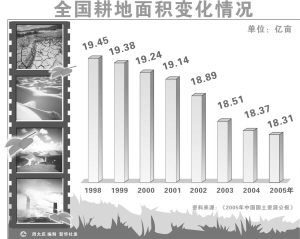 根据“十一五”规划纲要,到2010年末全国耕地面积必须守住不低于18亿亩这根红线。这意味着,“十一五”期间我国年均净减少耕地面积不能超过650万亩。