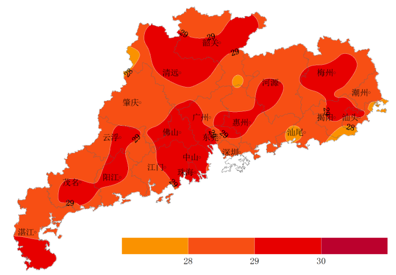 上周(5月14-20日),全省平均气温28.9℃,较常年同期偏高3.6℃,西南局部、珠江口两岸、东部局部和北部偏北29.0~30.0℃,其余大部分地区28.0~29.0℃(图1),与常年同期相比,北部偏高4.0~5.7℃,西南大部偏高2.0~3.0℃,其余大部分地区偏高3.0~4.0℃(图2),79%的站点平或破有记录以来同期最高值记录;全省平均累计降水量仅5.1毫米,较常年同期偏少9成,49%的站点滴雨未落,遂溪降水量105.4毫米,为全省最大(较常年同期偏多近8成),广-佛-肇庆-云浮局部出现20~37.6毫米降水;全省平均累计日照时数64.9小时,较常年同期偏多近1.2倍,南部沿海70~80小时,西北偏南局部39.8~60小时,其余大部60~70小时。