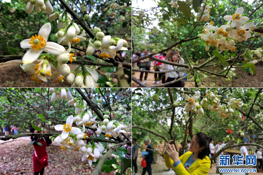 3月6日,化州市近10万亩化橘红陆续开花,吸引游客拍照。新华网发 关家钰 摄