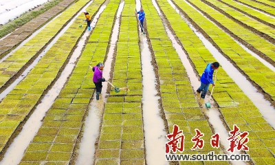 “十三五”期间,全省累计建成高标准农田2352万亩,粮食年均产量超过1200万吨。图为在广州从化鳌头镇中塘村香米基地,工作人员正忙碌移栽秧苗。南方日报记者 朱伟良 符超军 通讯员 邝健华 摄