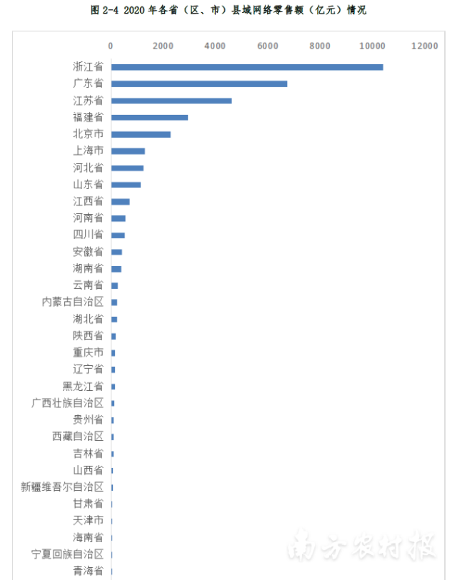 2020年各省(区、市)县域网络零售额(亿元)情况。数据来源欧特欧咨询