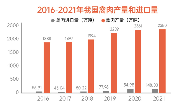 与此同时,我国的鸡肉进口量也在不断上升。中国畜牧业协会白羽肉鸡联盟总裁李景辉告诉记者,在2010-2019年期间,我国白羽肉鸡进口量一直维持在55万吨左右,而我国每年的鸡肉消费量约为1000万吨,进口量仅为我国消费量的5%。2019年之后,白羽肉鸡进口量逐步提升,2020年该值甚至翻了一倍。目前,我国白羽肉鸡进口量已从消费量的5%提升至了10%。