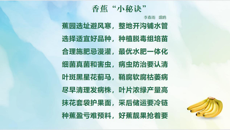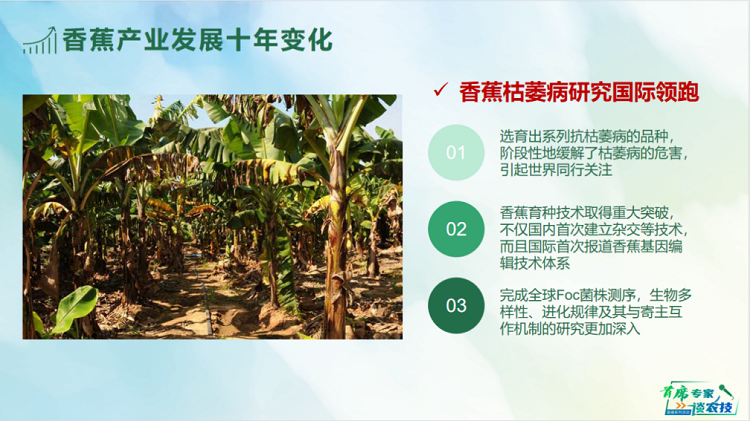 李春雨在直播中表示,近十年来,香蕉产业组织化程度明显提高,科技创新成果推广和应用范围更加广泛,国内对香蕉枯萎病的研究更是为广东香蕉产业可持续发展奠定了良好基础。