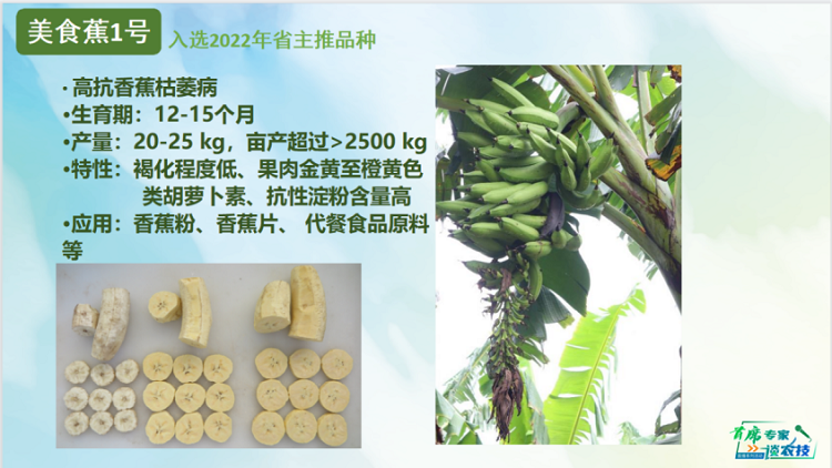 盛鸥在直播中介绍了入选2022年广东省主推品种的美食蕉1号,其淀粉含量高,是近几年选育的优新品种,“煎、炒、烹、炸”都可以让人们尽享它的美味。作为高抗香蕉枯萎病的一个香蕉品种,生育期12-15个月,亩产可超2500公斤。
