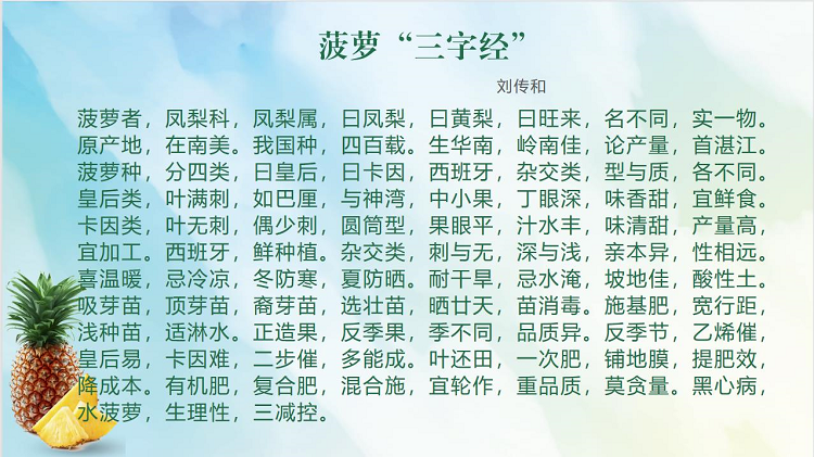 “使用‘12(2)3’模式可以明显提高菠萝果实品质,降低‘黑心病’‘水菠萝’的发生。”刘传和对菠萝产业现状、菠萝优新品种、菠萝高品质种植技术作了详细介绍,重点推介了菠萝优质高效种植法宝--“12(2)3”模式。