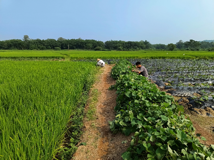 朱景研和社员在田间劳作,一半水稻,一半红薯