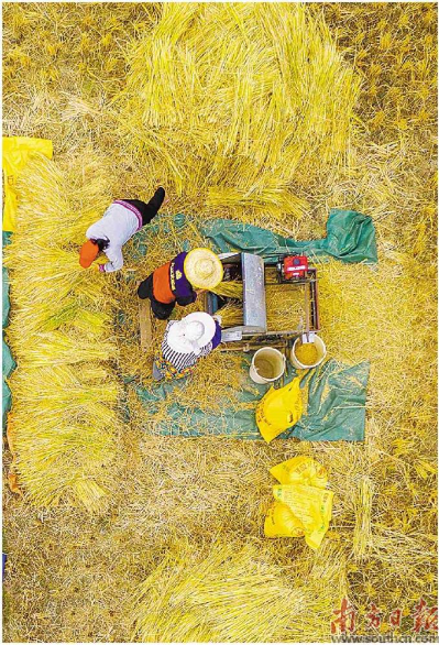 在清远连山太保镇黑山梯田,当地村民正忙着收割水稻。