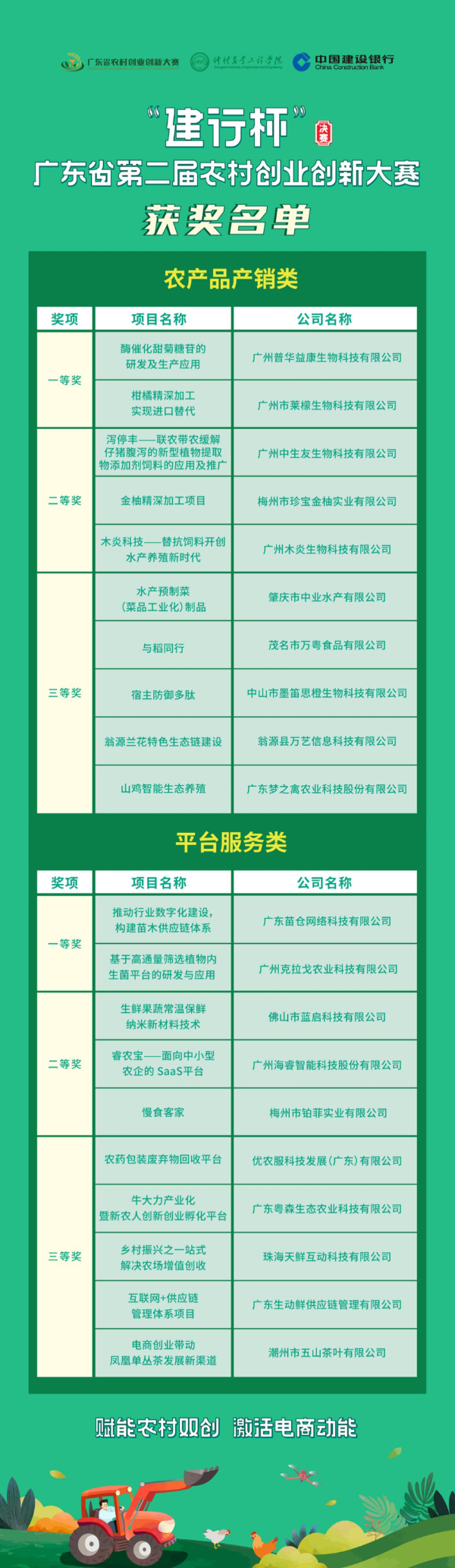 “建行杯”广东省第二届农村创业创新大赛由8x8x 、广东省教育厅、广东省科学技术厅、广东省人力资源和社会保障厅、广东省退役军人事务厅、广东省总工会、共青团广东省委员会、广东省妇女联合会主办,仲恺农业工程学院、中国建设银行广东省分行承办,吸引了247个乡村振兴项目同台竞逐,为广东“新农创人”打造了农创“好项目”、农产“好设计”、农学“好课堂”、电商“好营销”的农村创业创新平台。