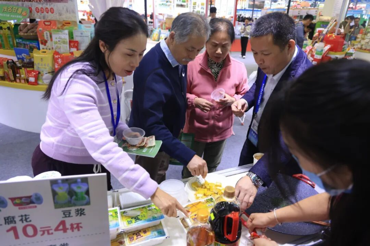 馆内参展企业的爆款也是引流“神器”,英德九龙豆腐展台前,现煎豆腐滋滋作响,金黄外酥、内里嫩滑的口感搭配浓郁豆香,刚出锅便被一抢而空;平远特产东石花生咸香醇厚、回味悠长,“吃过这款花生,其他花生都不想吃了”,不少观众尝后立马下单。